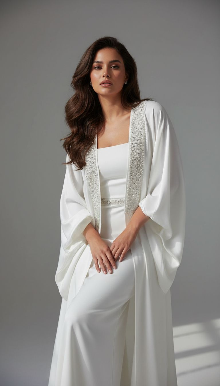 A luxurious two-piece set crafted from premium crepe, featuring a flowing dress with a handcrafted...