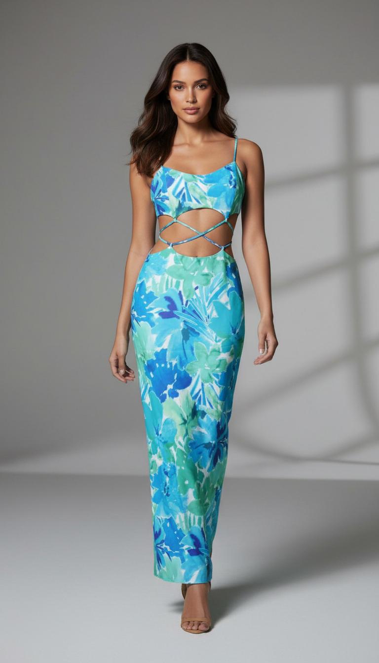 women’s sleeveless bluish greenish long dress featuring a wavy tie Infront