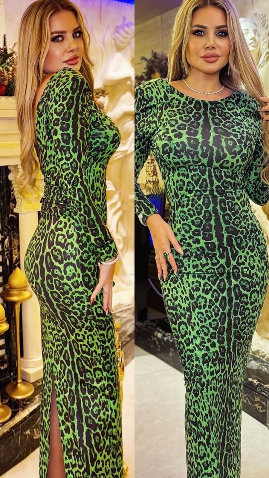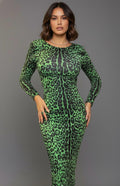 A STRIKING AND STYLISH GREEN LEOPARD PRINT DRESS THAT HUGS THE BODY BEAUTIFULLY FEATURING LONG SLEEVES AND A FIGURE-FLATTERING FIT