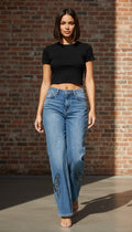 women’s high waited denim wide leg pants featuring a glittery butterfly print on the bottom of the left side