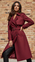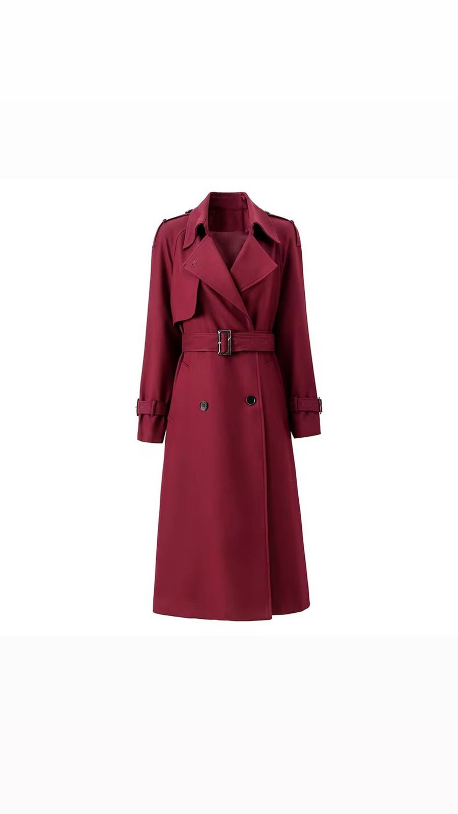 A STYLISH AND ELEGANT LONG TRENCH COAT WITH A BELT PERFECT FOR A SOPHISTICATED LOOK