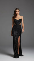 women’s sleeveless long dress with a V-shape corset styling at the top featuring a cross shape at the back and a side slit