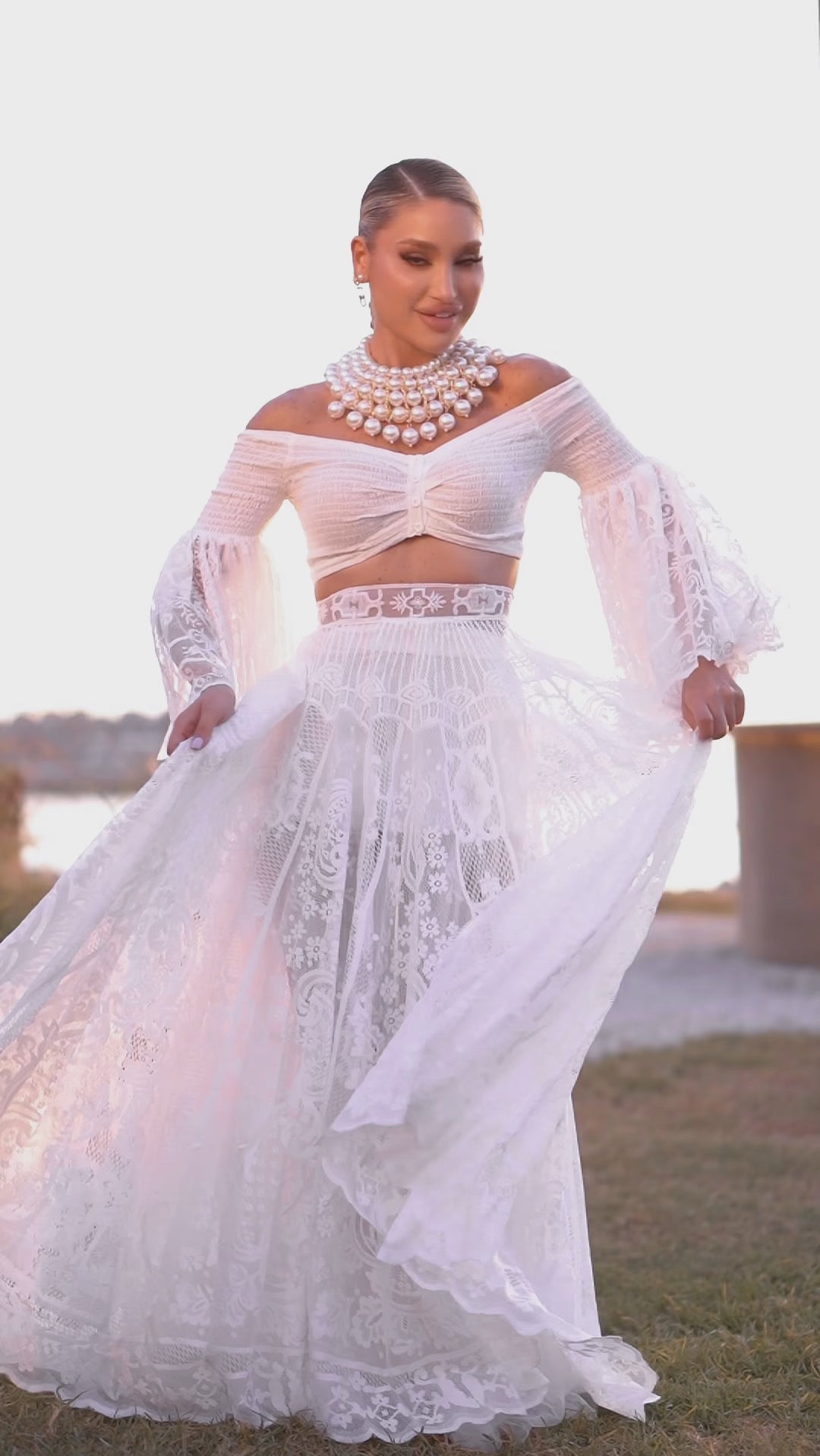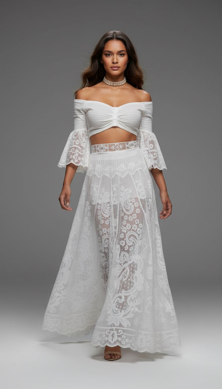 women's three pieces set with a dental skirt and chiffon skirt featuring a small button crop top