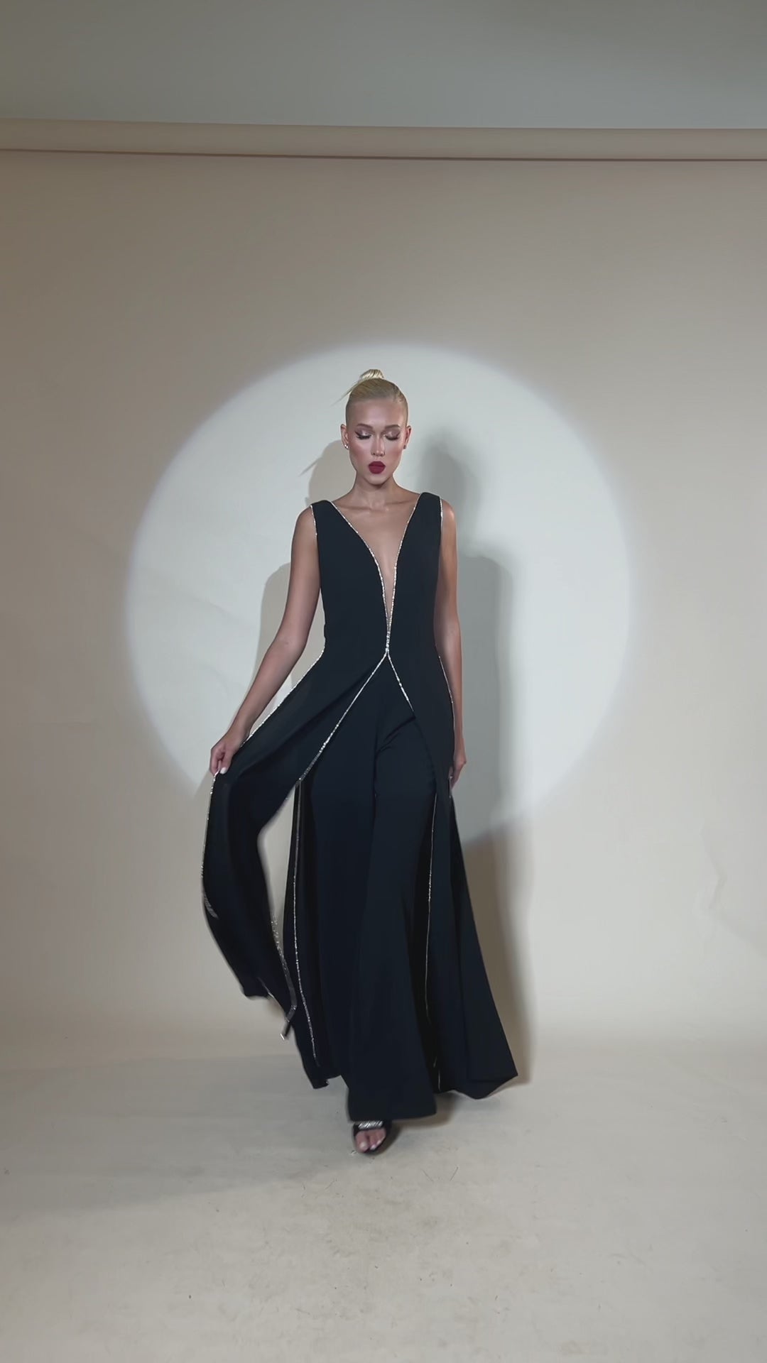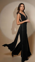 Women’s sleeveless jumpsuit featuring a V-neck slit on the top