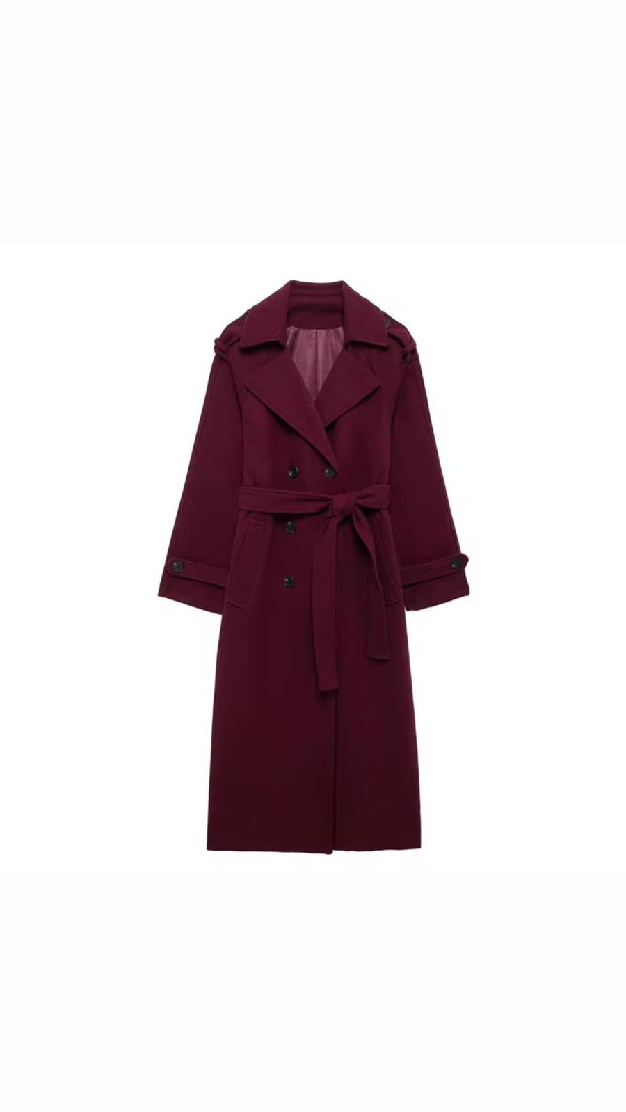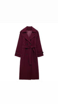 ELEGANT BURGUNDY TRENCH COAT WITH A WAIST BELT AND CLASSIC STYLISH DESIGN