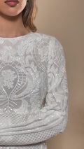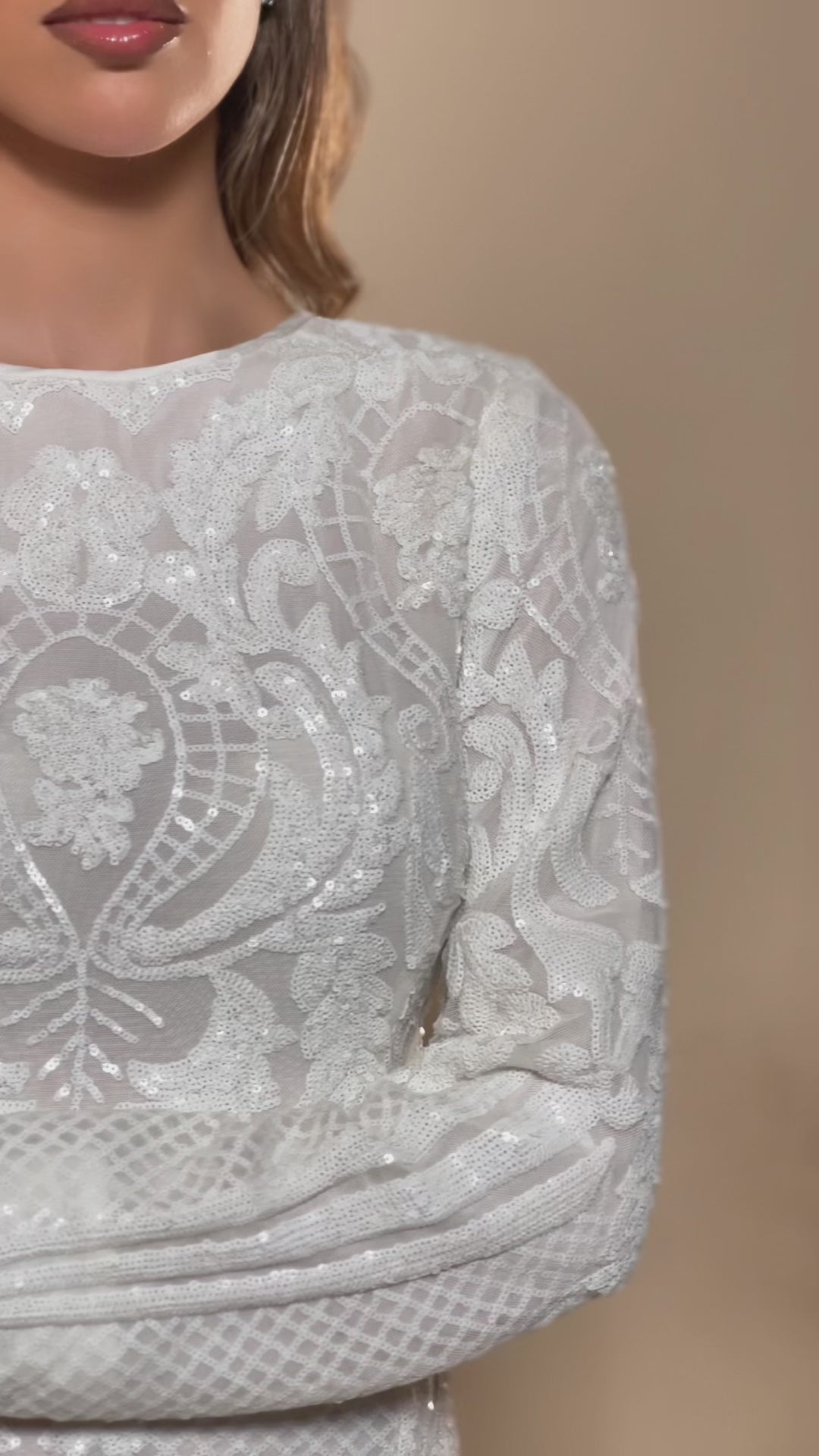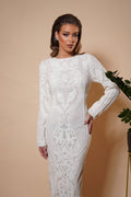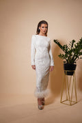 women’s long sleeve white long dress with a graphic design on it featuring a fur touch on the bottom