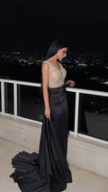 women's long satin black wide skirt featuring a sparkle sleeveless crop top with silveric strass