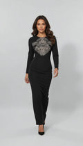 Women’s black crepe long sleeve featuring the Hilda flower design on the top long dress