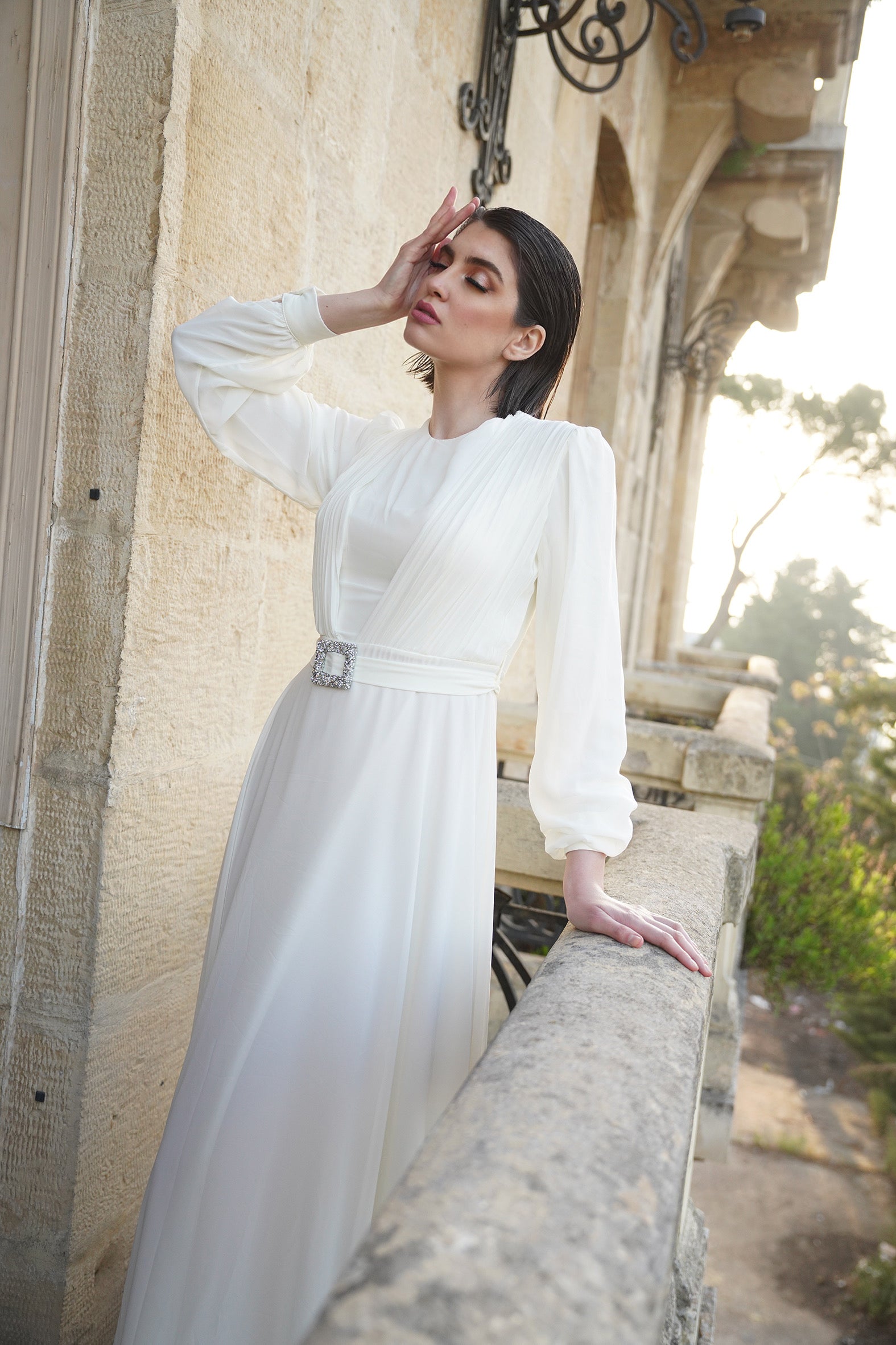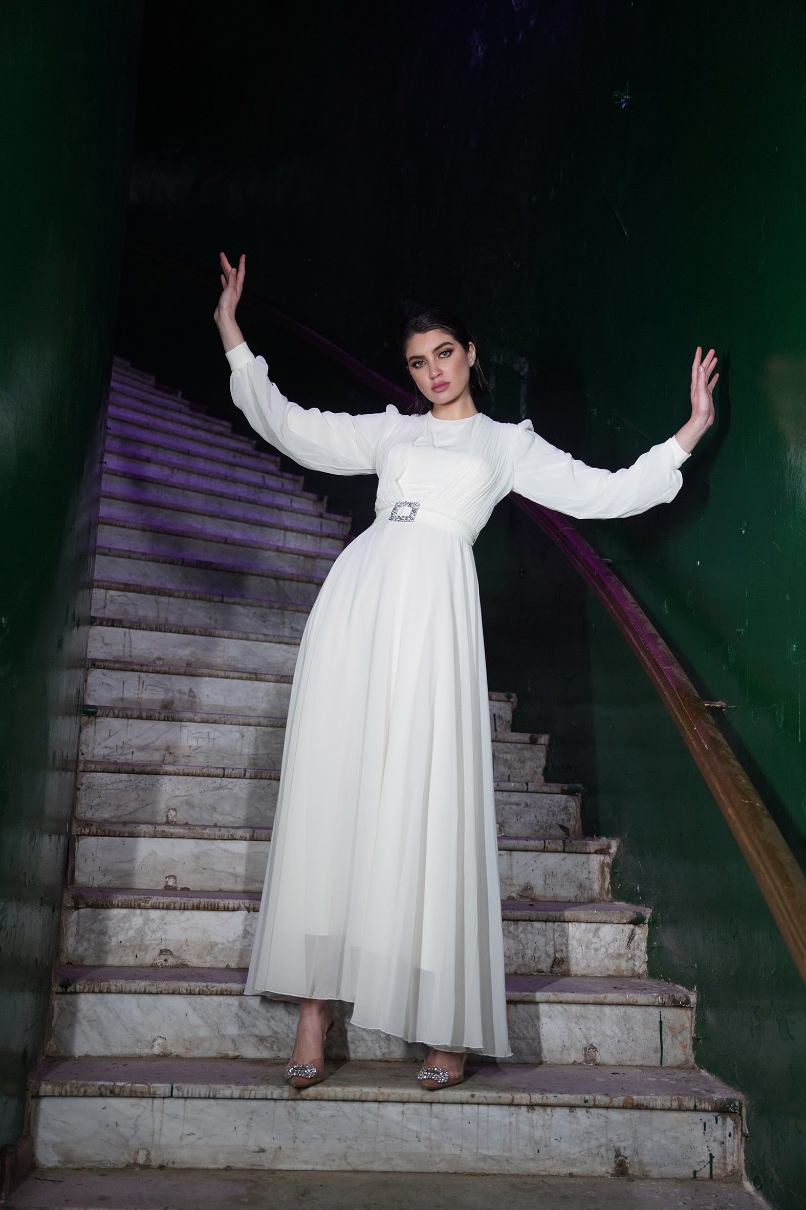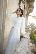 Women’s soft white long sleeves dress featuring a square strass belt in the middle