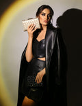 Women’s eco leather set with a short skirt and V-shaped shaped crop top