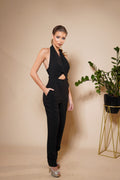Women’s backless sleeveless tight-wide leg jumpsuit featuring a small opening on the belly