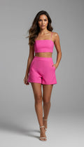 Get ready to make a statement with our Dainty Set. This set features a bright pink crop top and shorts, paired with a matching blazer. Perfect for a bold and stylish look that will turn heads. Stand out with this eye-catching and trendy ensemble.
