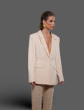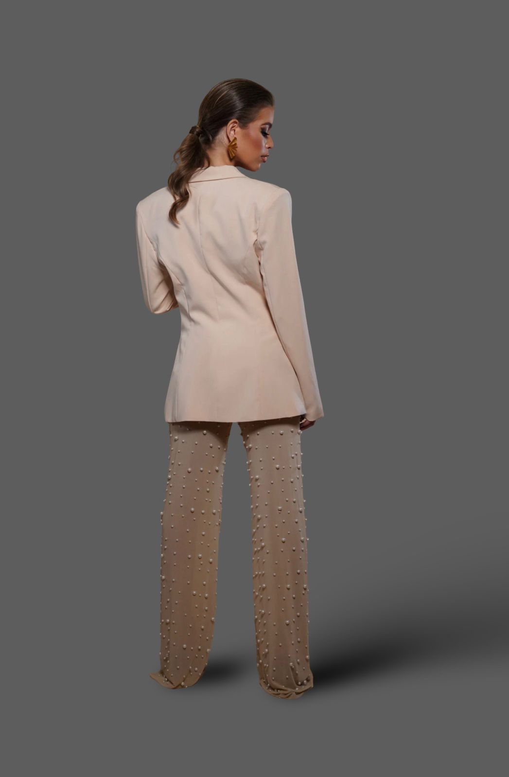 Women’s beige long wide pants featuring a pearl on both sides with a simple midi length blazer conceding a round botton in the middle