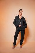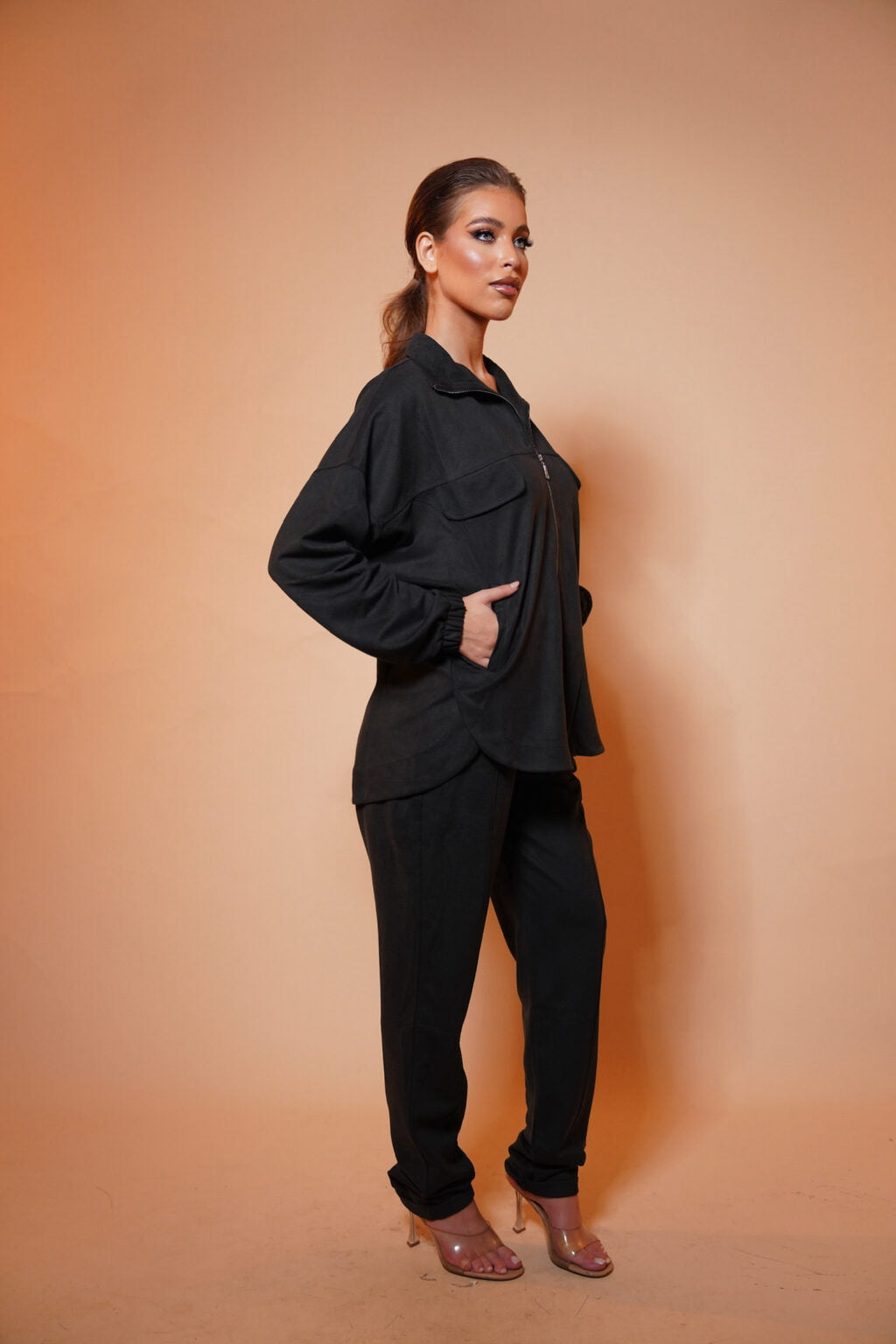 Women’s long sleeves wide leg pants and midi length jacket featuring pockets on it which is available in two colors