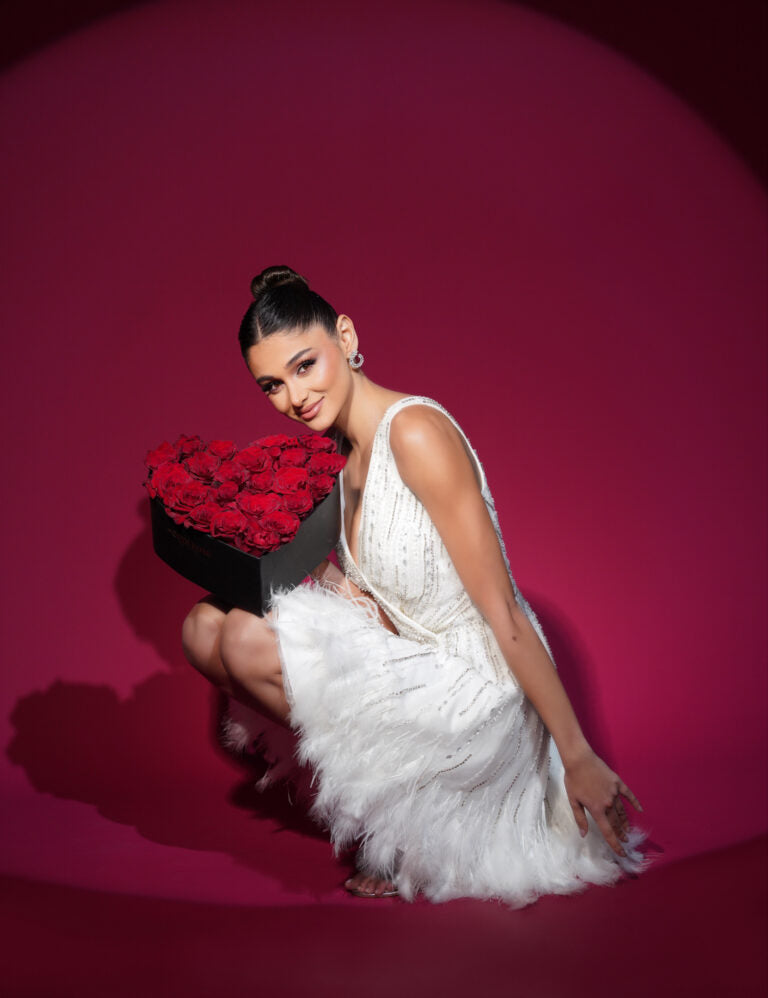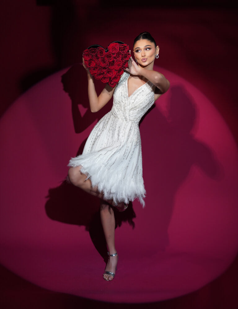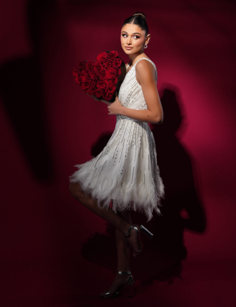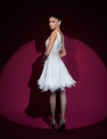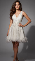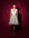 women’s sleeveless mini length dress with silver glitter featuring a slight fur touch at the bottom