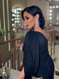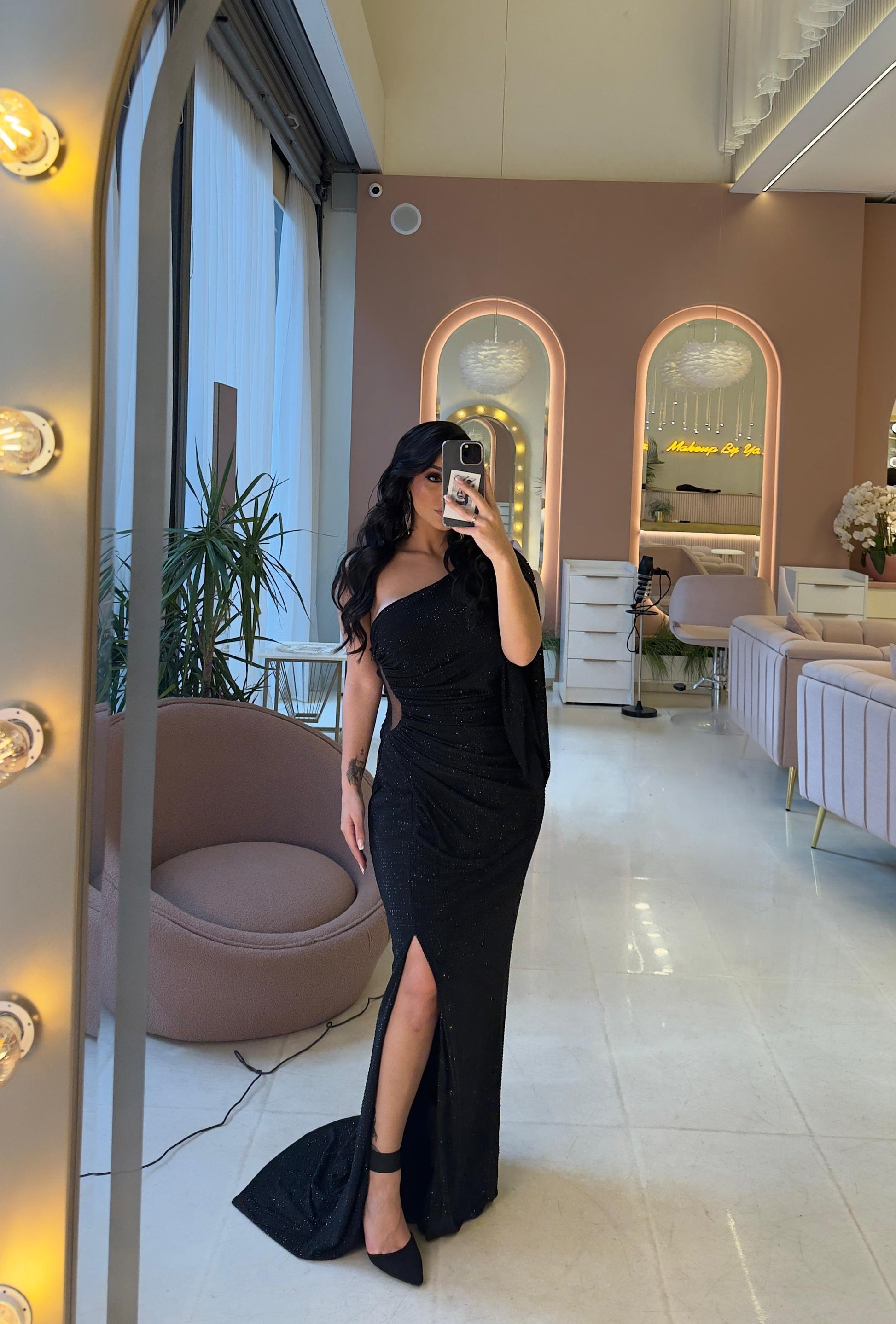 women's one shoulder long dress featuring a black sparkled strass with a side slit