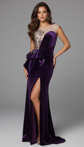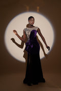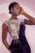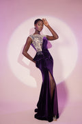 women’s sleeveless velvet violet long dress featuring a branch bloom flower on its right side with a slit in the middle